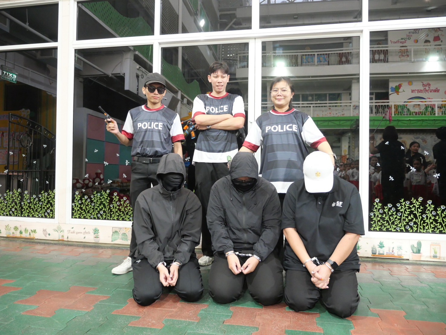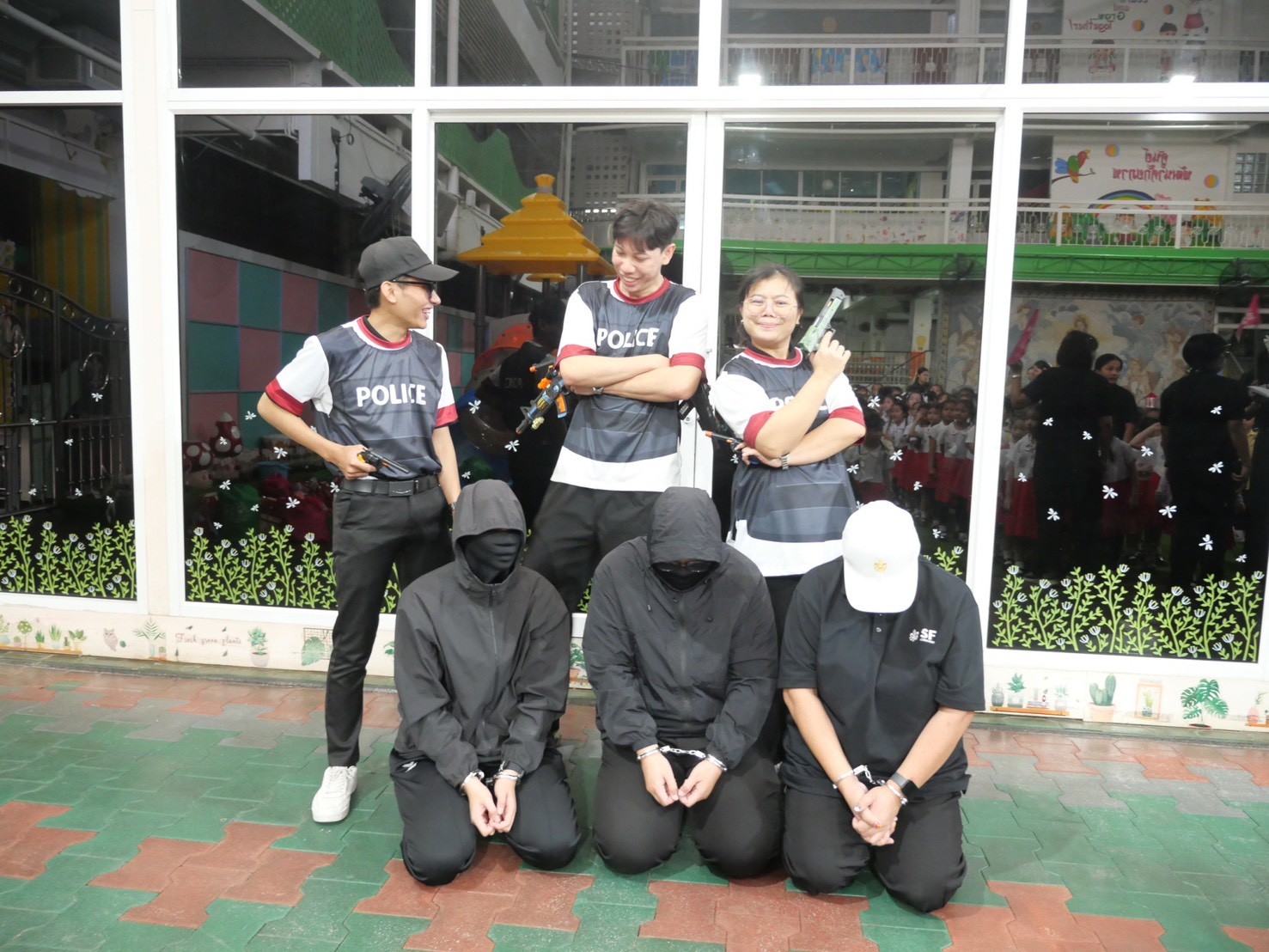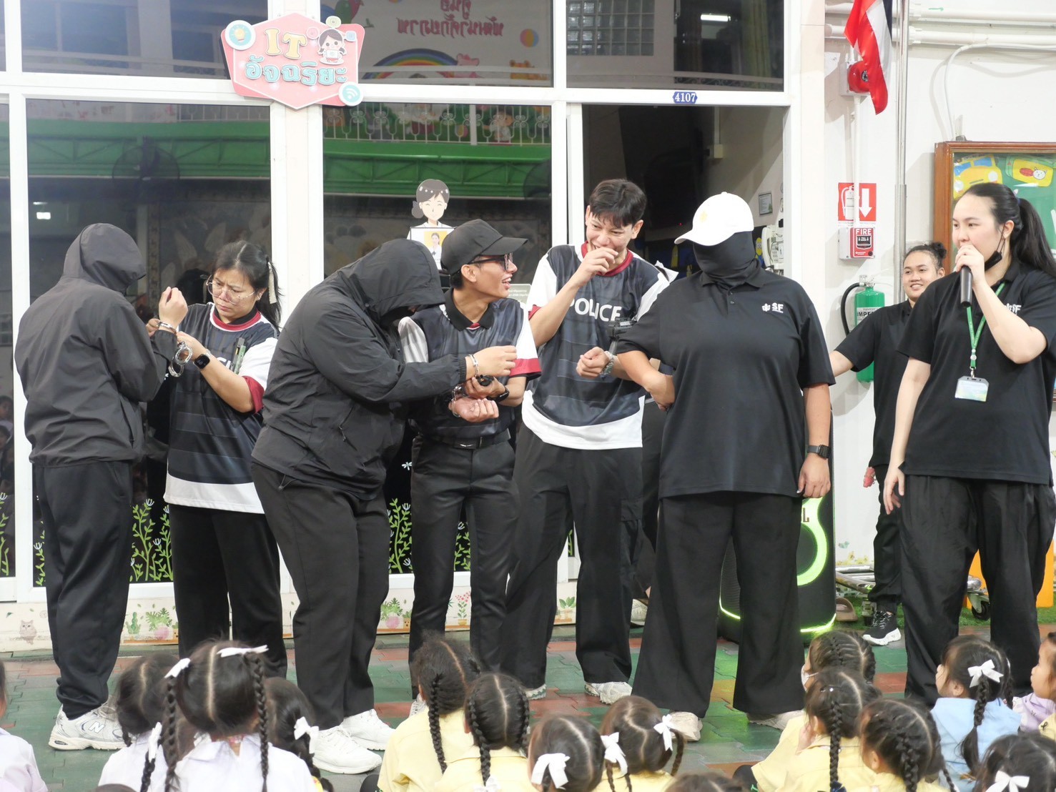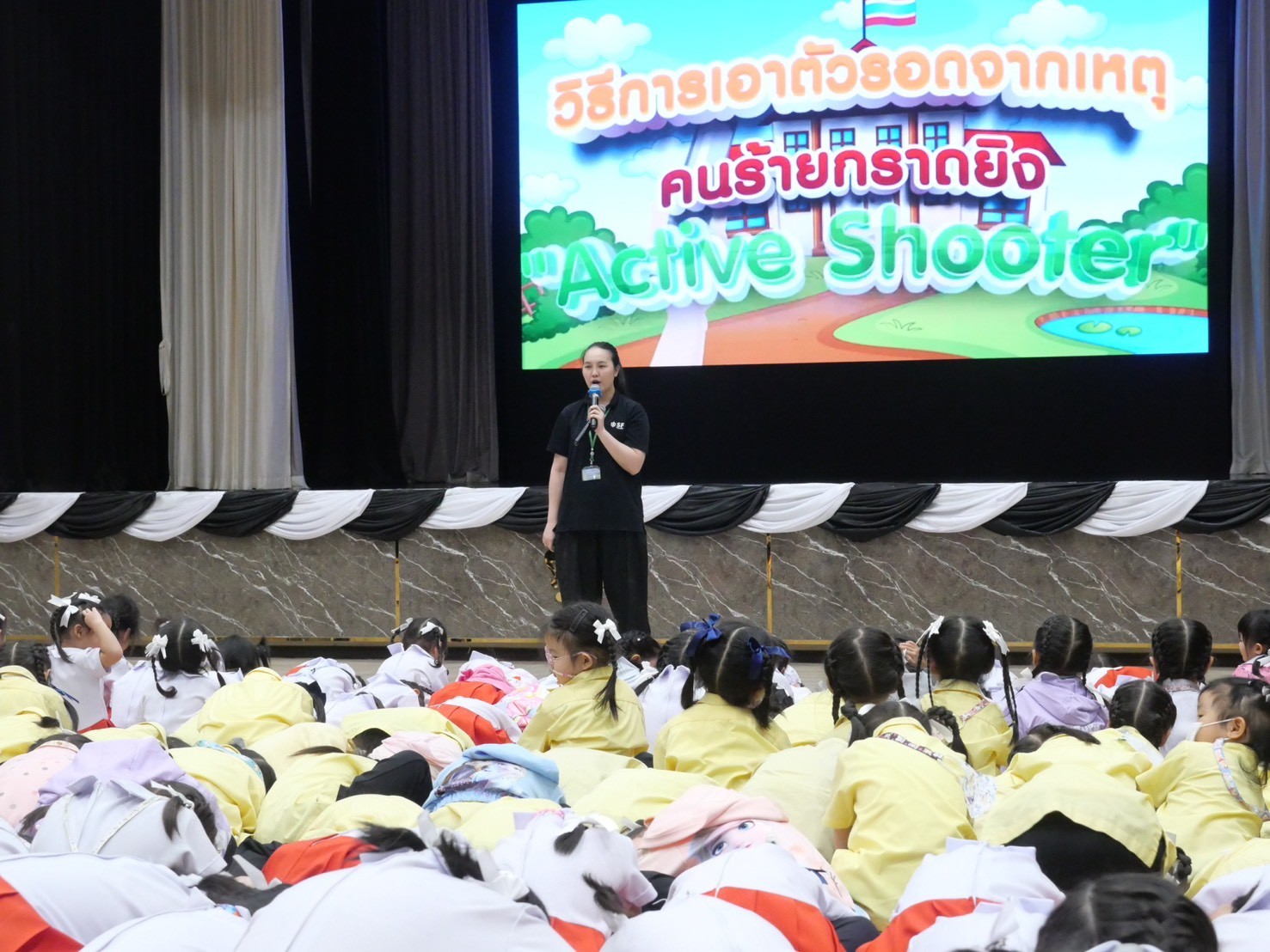 ในการนี้ขอขอบคุณ คุณครูจากระดับประถมศึกษา และมัธยมศึกษา ที่ร่วมเป็นวิทยากร และสวมบทบาทสมมุติเป็นเจ้าหน้าที่ตำรวจ และผู้ก่อเหตุ เด็กๆ บอก…สมจริงมากค่ะ ในตอนท้ายได้มีการรวมเด็กๆ และแจ้งว่าเป็นการจำลองสถานการณ์เพื่อฝึกซ้อม และทุกคนเป็นคุณครูผู้ใจดีของพวกหนูๆ เองค่ะ