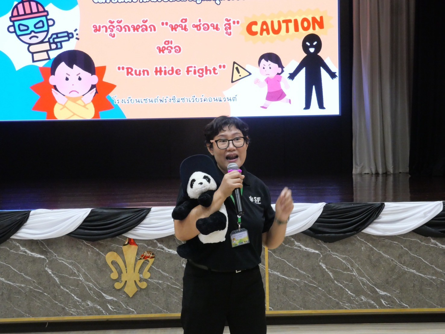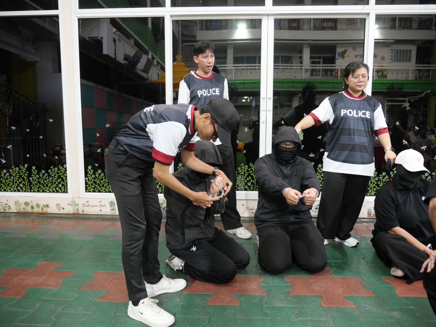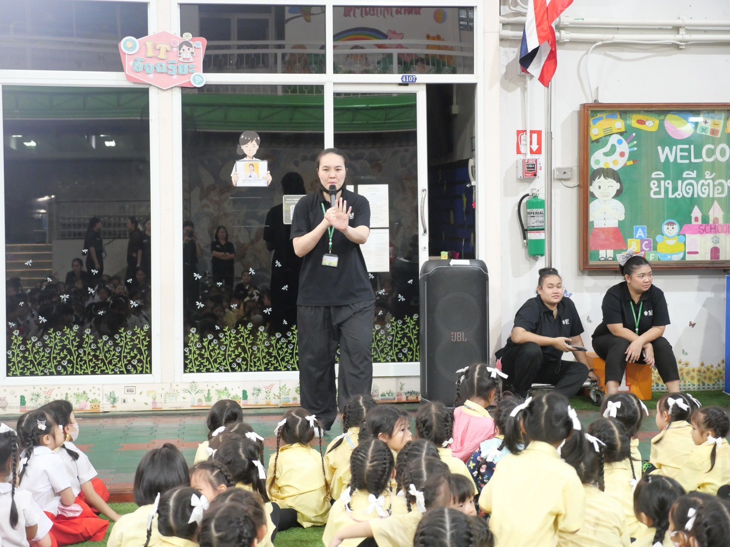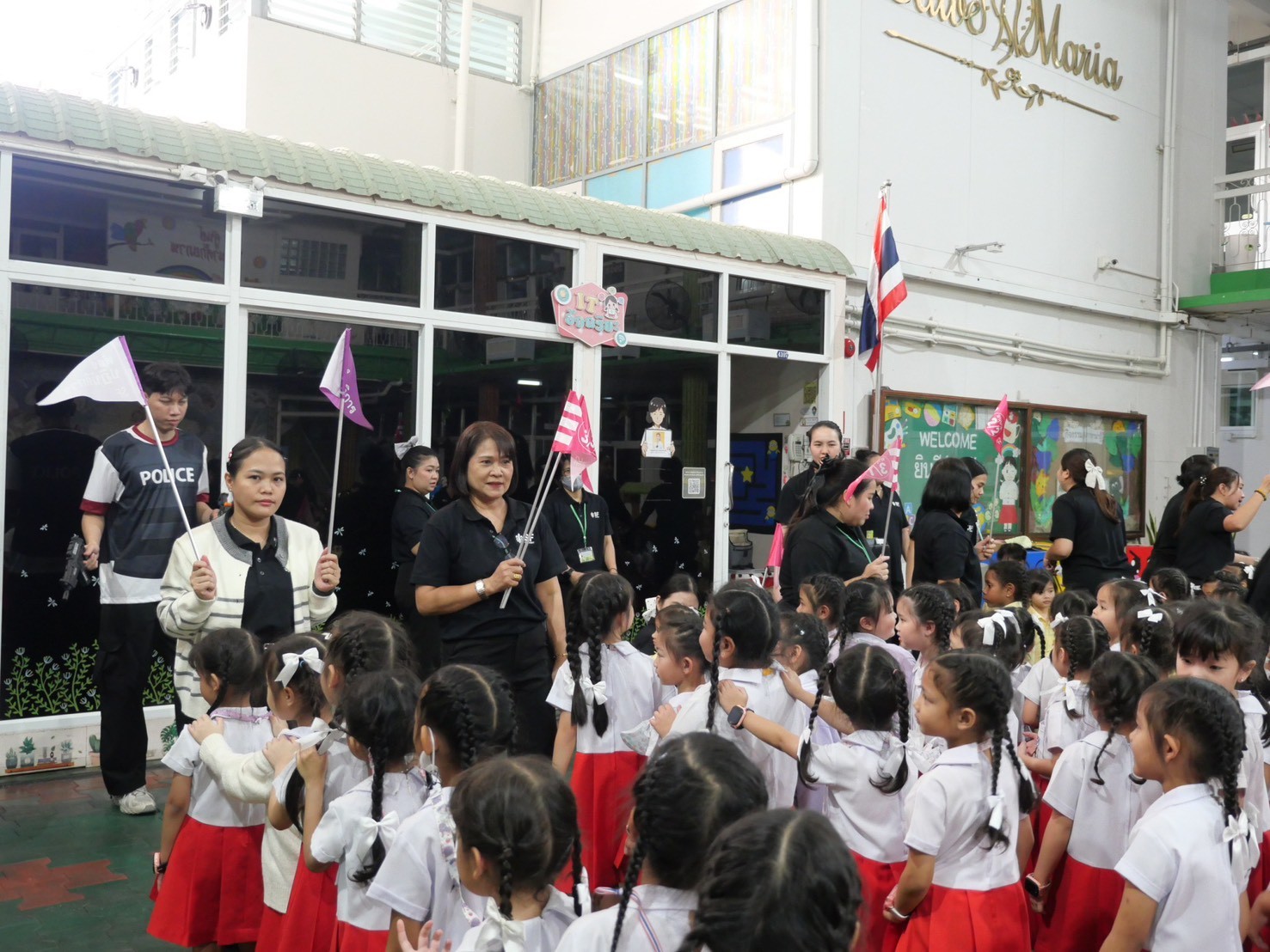 ในการนี้ขอขอบคุณ คุณครูจากระดับประถมศึกษา และมัธยมศึกษา ที่ร่วมเป็นวิทยากร และสวมบทบาทสมมุติเป็นเจ้าหน้าที่ตำรวจ และผู้ก่อเหตุ เด็กๆ บอก…สมจริงมากค่ะ ในตอนท้ายได้มีการรวมเด็กๆ และแจ้งว่าเป็นการจำลองสถานการณ์เพื่อฝึกซ้อม และทุกคนเป็นคุณครูผู้ใจดีของพวกหนูๆ เองค่ะ