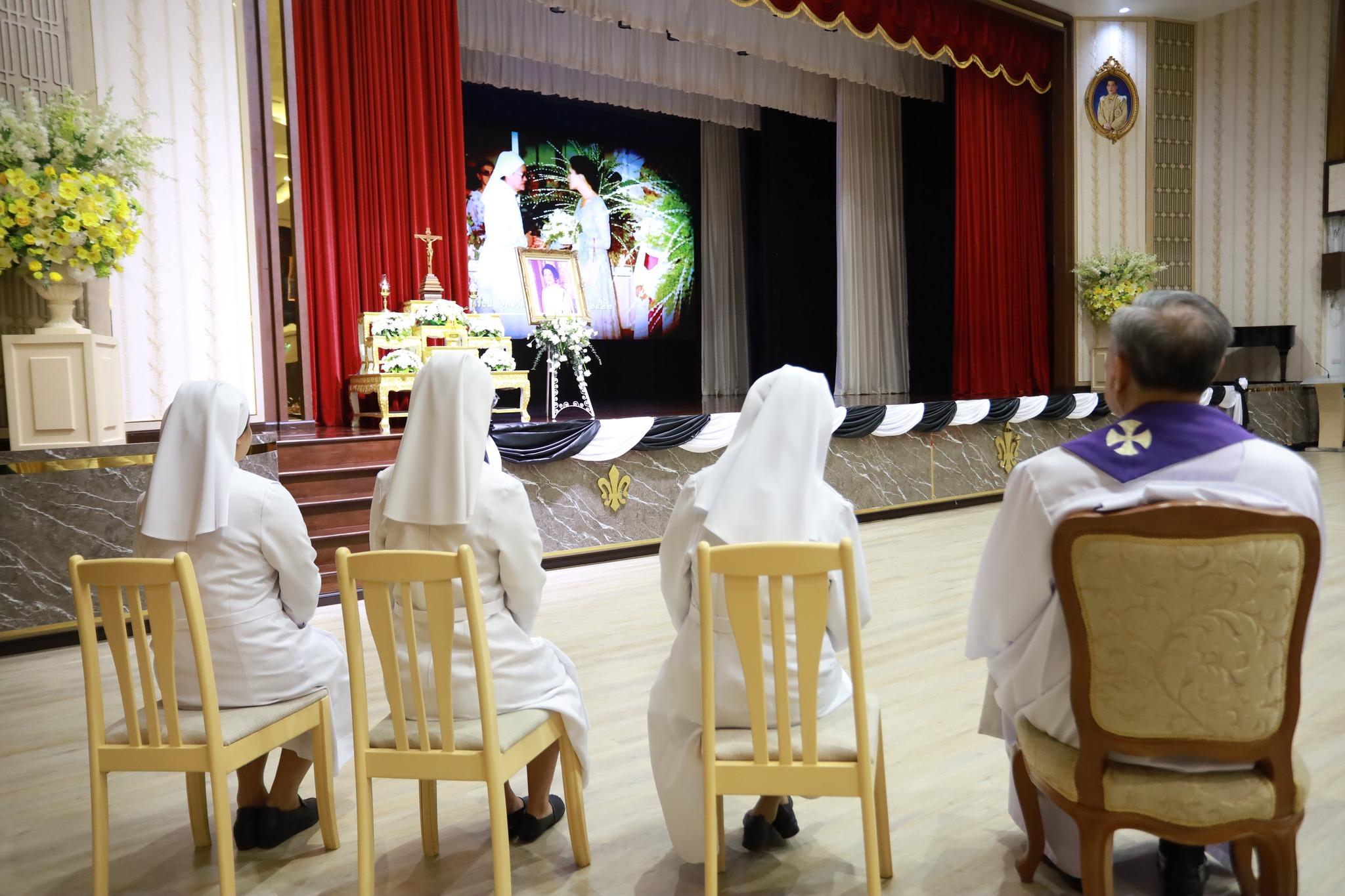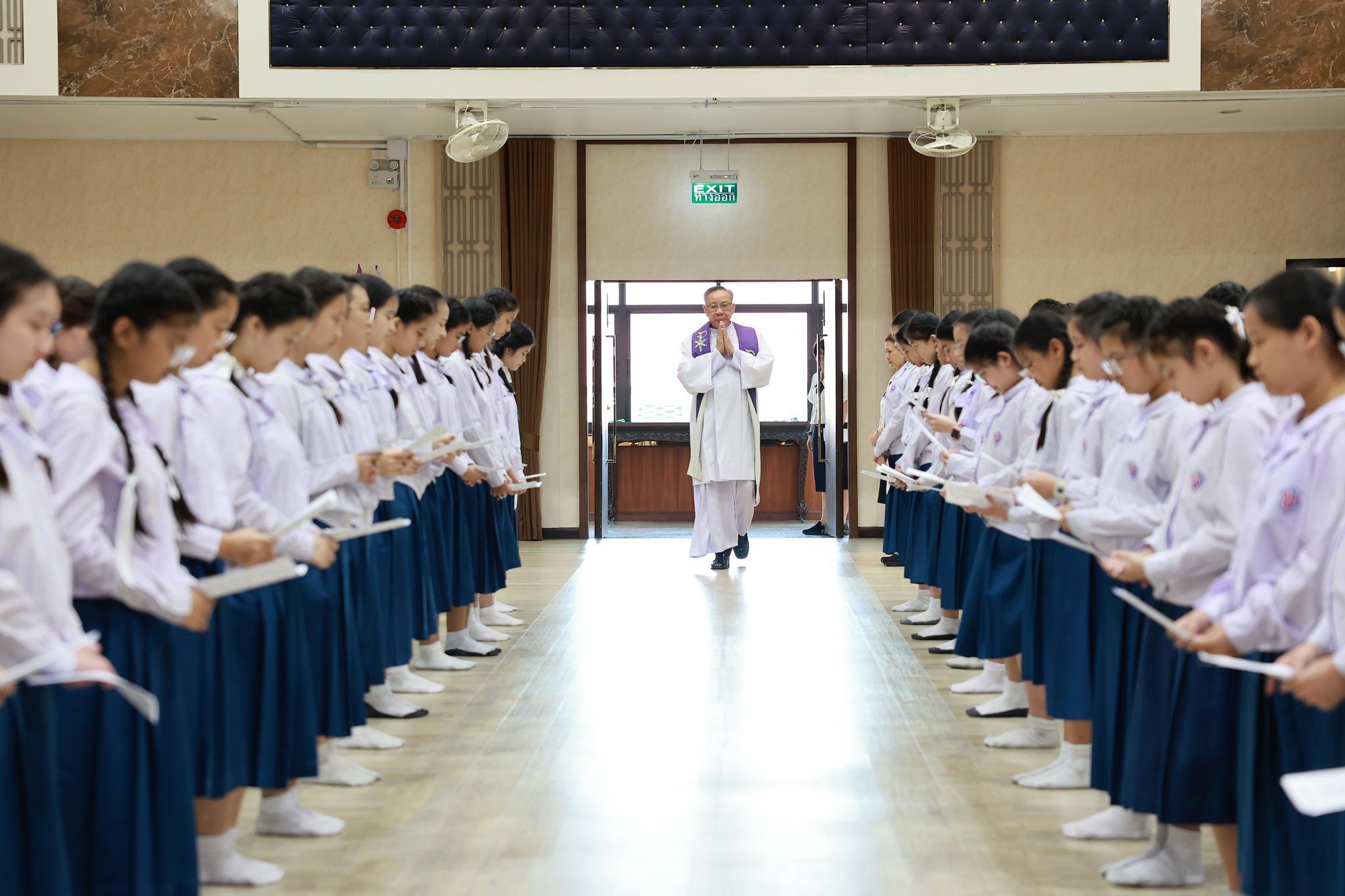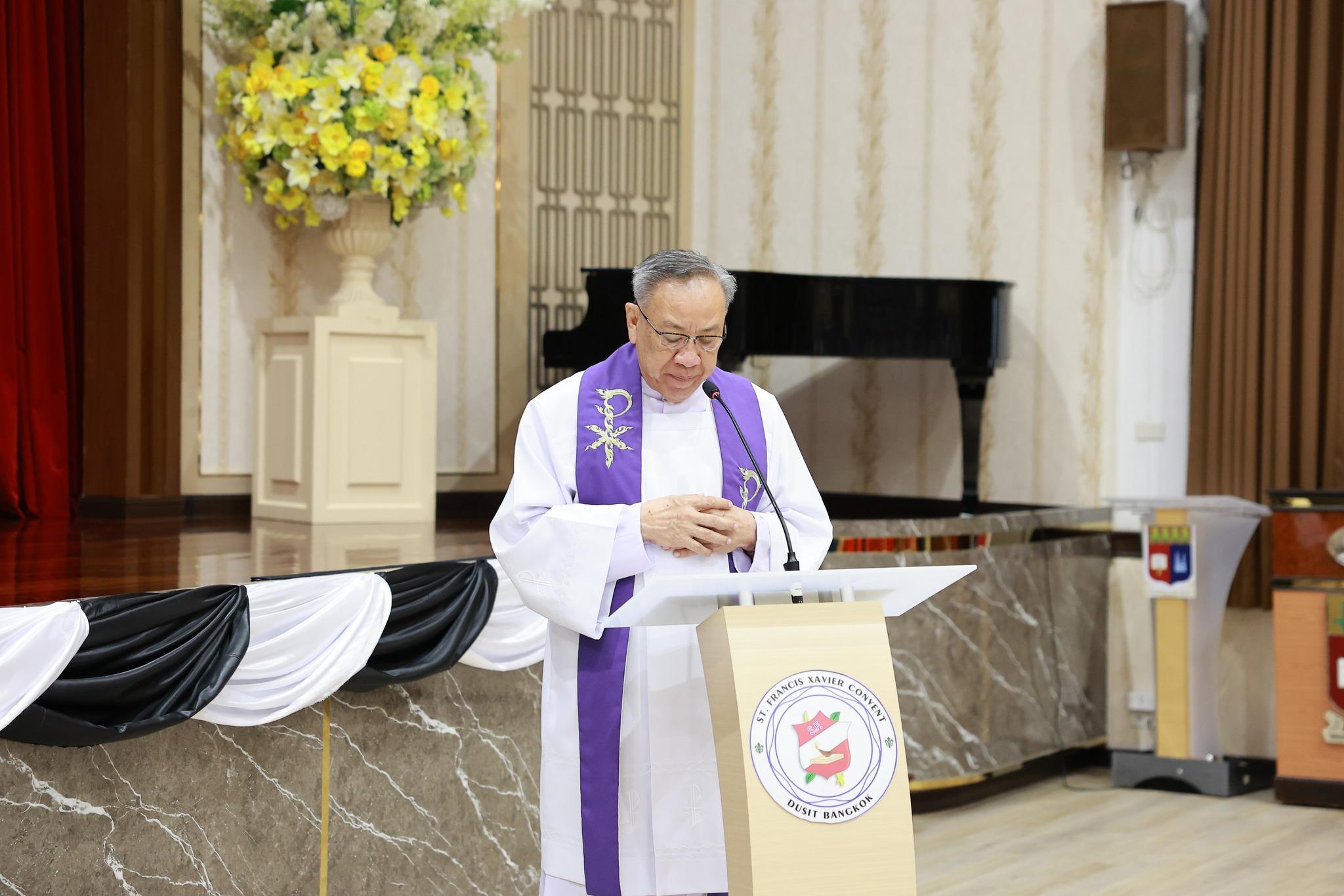 จากนั้นในเวลา 10.15 น. ได้มีวจนพิธีกรรมโดยมีตัวแทนนักเรียนทุกระดับชั้นเข้าร่วมพิธี และได้รับเกียรติจากคุณพ่อทวีศักดิ์ กิจเจริญ เจ้าอาวาสวัดนักบุญฟรังซิสเซเวียร์ เป็นประธานในพิธี มีการกล่าวถวายอาลัย โดยเซอร์เบนิลดา สมจันทร์ ก่อนที่จะชมวีดีทัศน์ เซนต์ฟรังฯ ขอน้อมถวายอาลัย สมเด็จพระพันปีหลวง เพื่อน้อมรำลึกในพระมหากรุณาธิคุณเป็นล้นพ้นอันหาที่สุดมิได้ที่ทรงมีต่อโรงเรียน