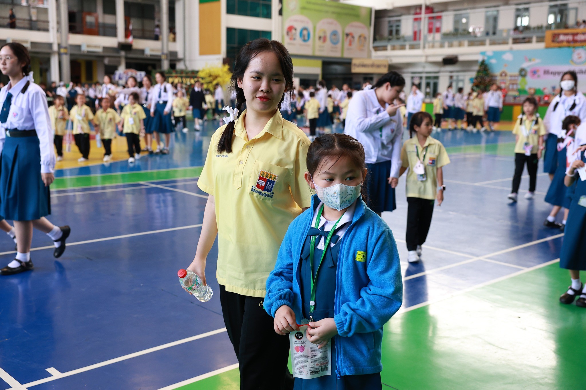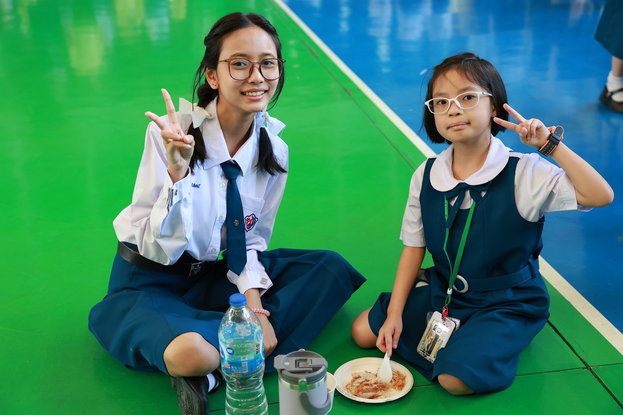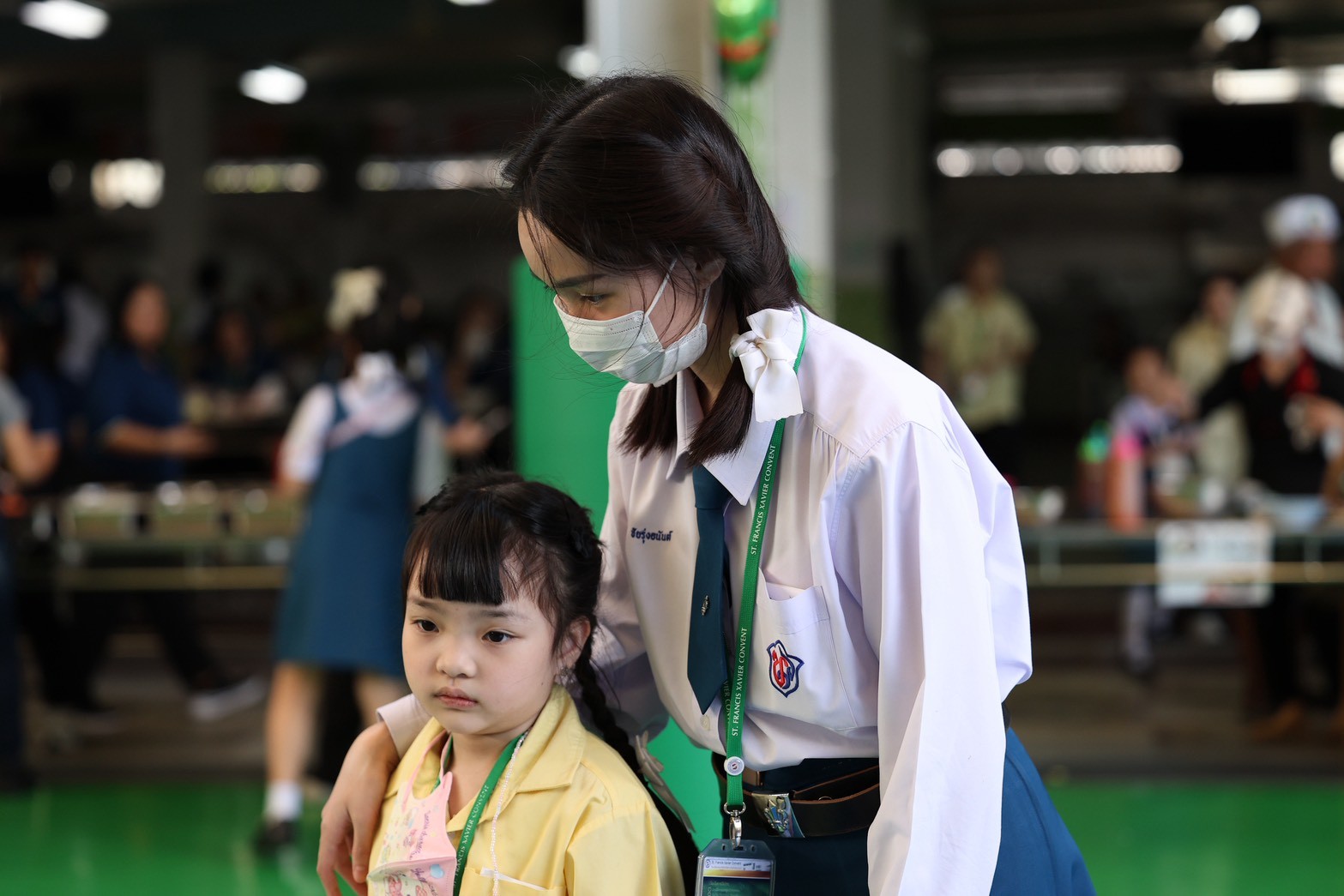 พี่ๆ ม.2 – ม.6 ก็เดินไปรับน้อง ป.1 – ป.2 มารับประทานอาหาร