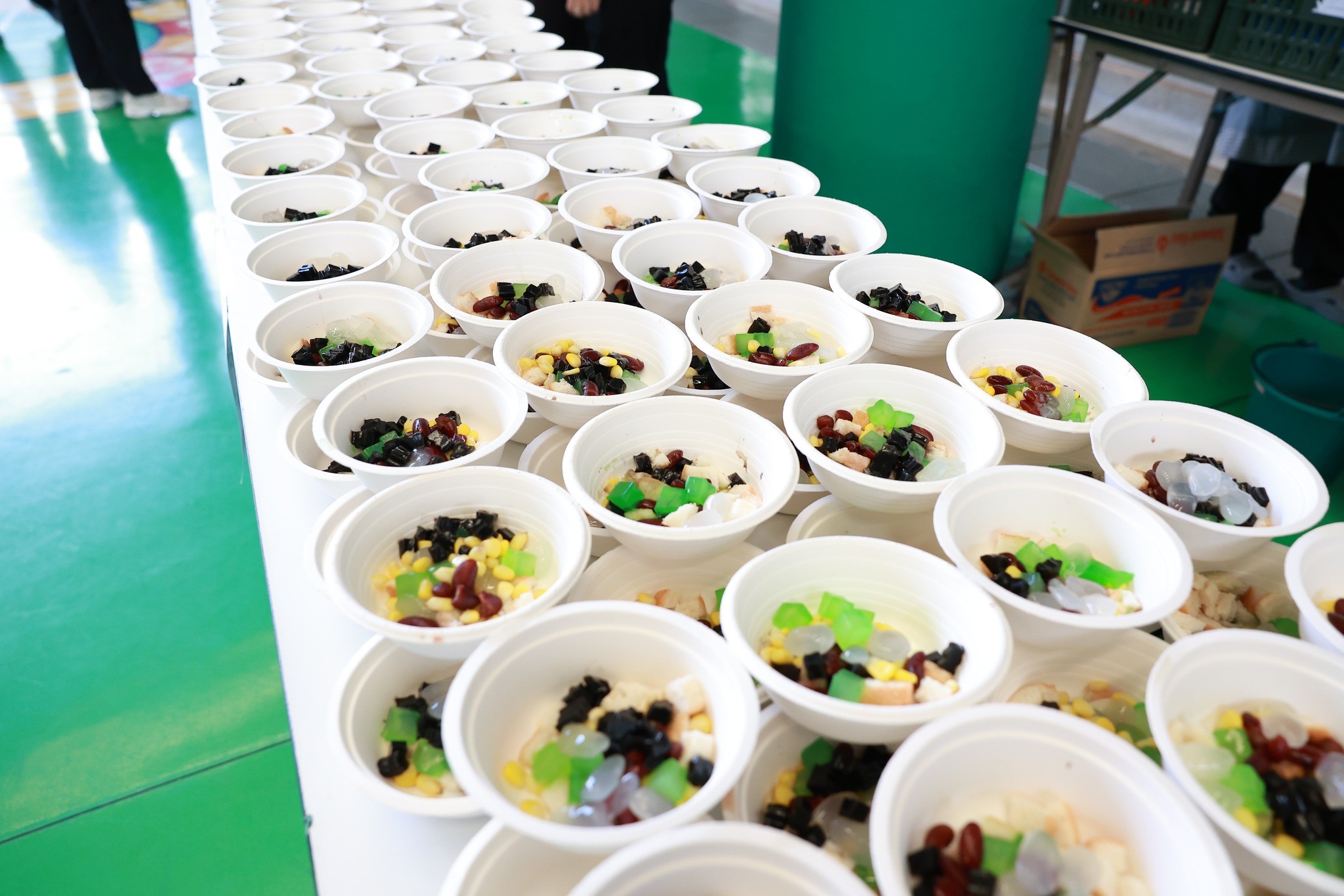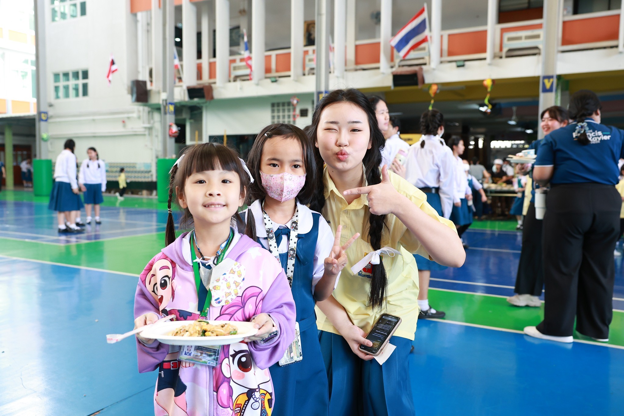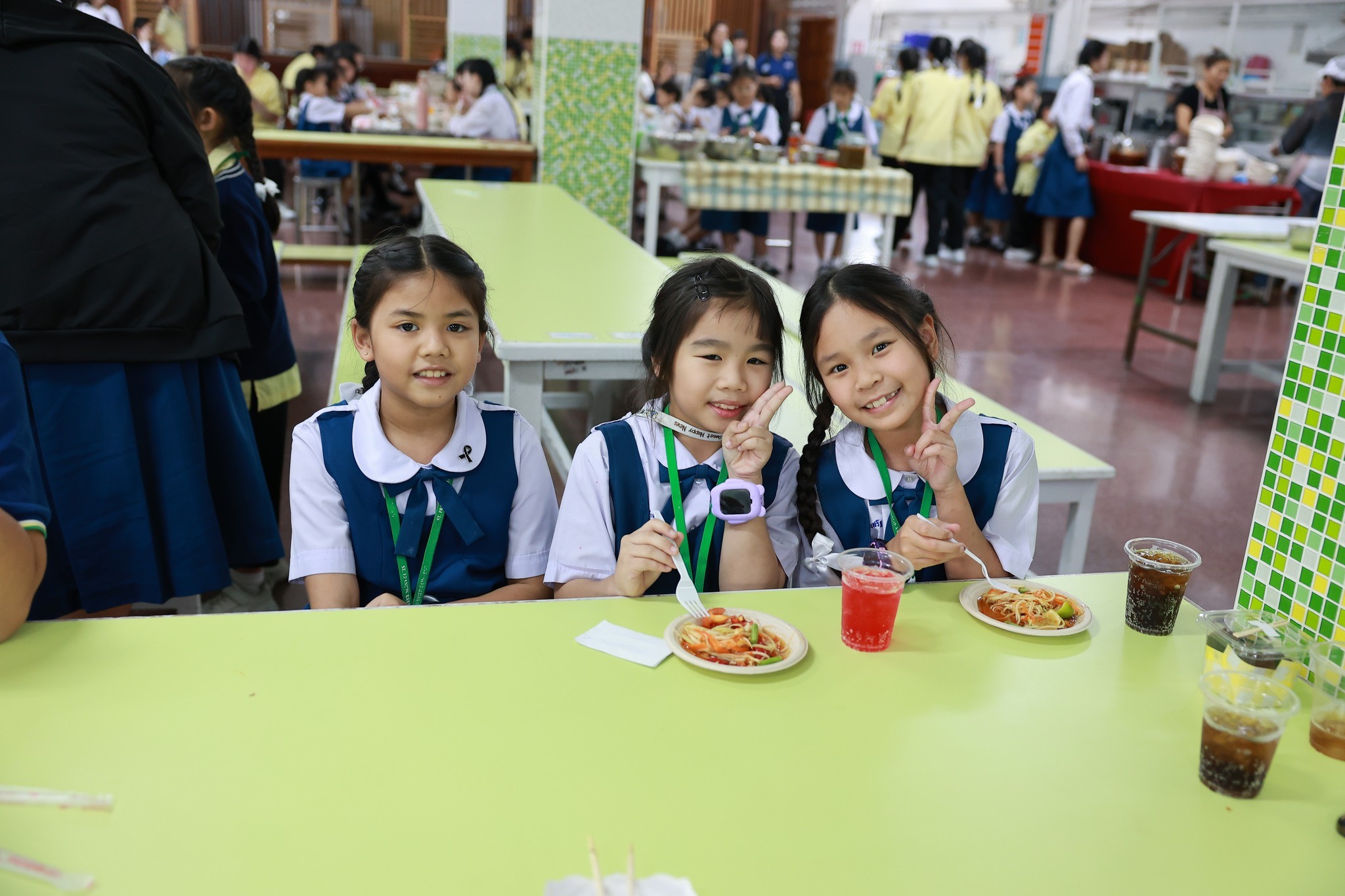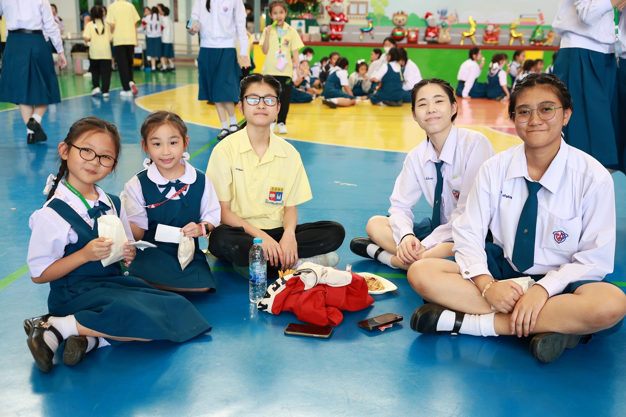 พี่ๆ ม.2 – ม.6 ก็เดินไปรับน้อง ป.1 – ป.2 มารับประทานอาหาร